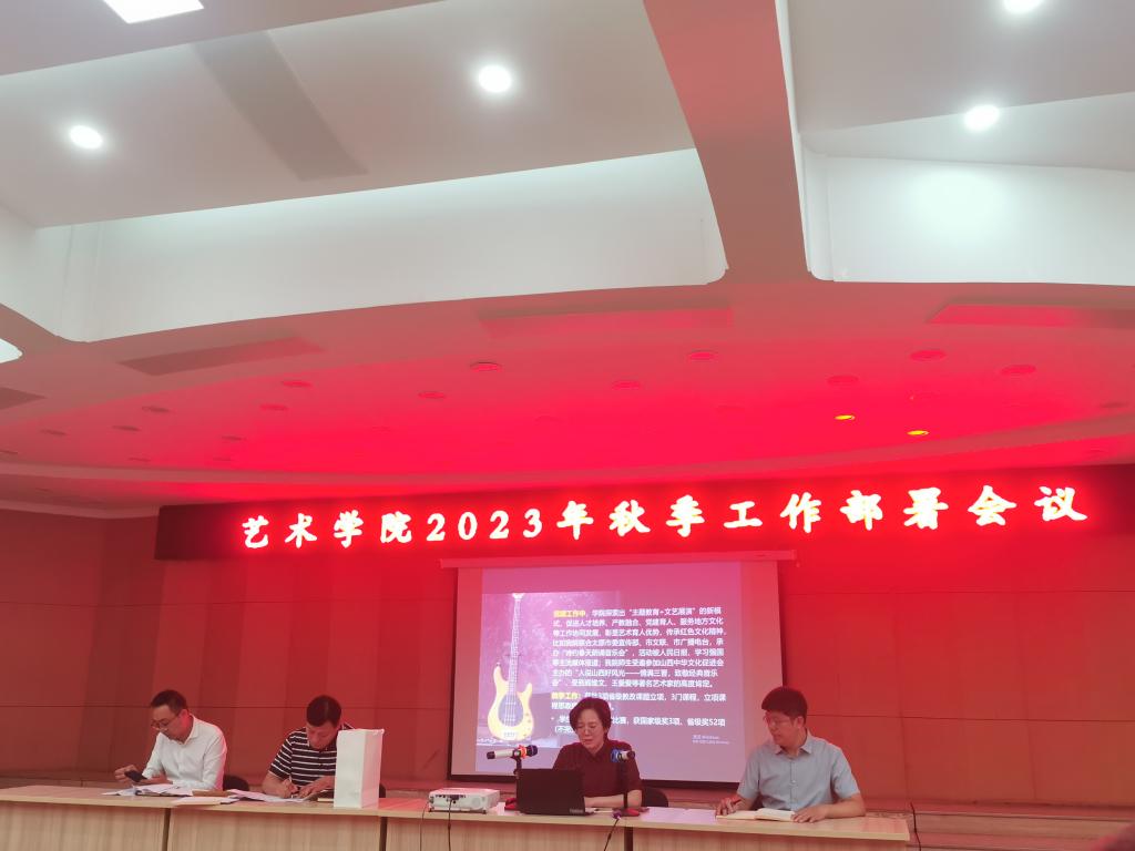 首先,院党委书记郭云霞进行新学期动员讲话,重点结合学校2023年秋季学期工作部署会议精神,围绕学院年度工作目标任务完成情况做了分析总结,肯定成绩的同时重点指出当前存在的问题与不足。她从学校发展、学院发展以及教师个人发展的角度,进一步鼓励全体教职工要强化责任意识和主人翁意识,以时不我待的精神,积极申报高水平项目、产出标志性成果等,提升个人业务水平的同时助推学校双一流建设及艺术学科的发展。她还就党建融合中心工作、安全稳定、意识形态、师德师风建设等方面做了具体要求。院党委副书记田维飞针对学生就业工作、考研情况、新学期新生报到工作和入学教育等相关学生工作做了详细地安排部署。副院长李仁伟对新学期的教学工作任务及本科教育教学审核评估工作进行分析解读和部署。