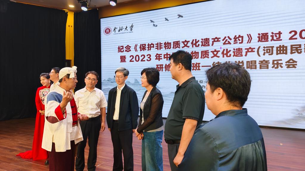 9月10日晚,纪念《保护非物质文化遗产公约》通过 20 周年活动暨 2023 年中国非物质文化遗产(河曲民歌)传承人研修培训班——结业说唱音乐会在太原市工人文化宫(音乐厅)举办,出席音乐会的领导有:山西省文化和旅游厅厅长王爱琴;中北大学副校长尹建平;山西省文化和旅游厅党组成员、副厅长陈少卿及山西省文旅厅相关处室领导。