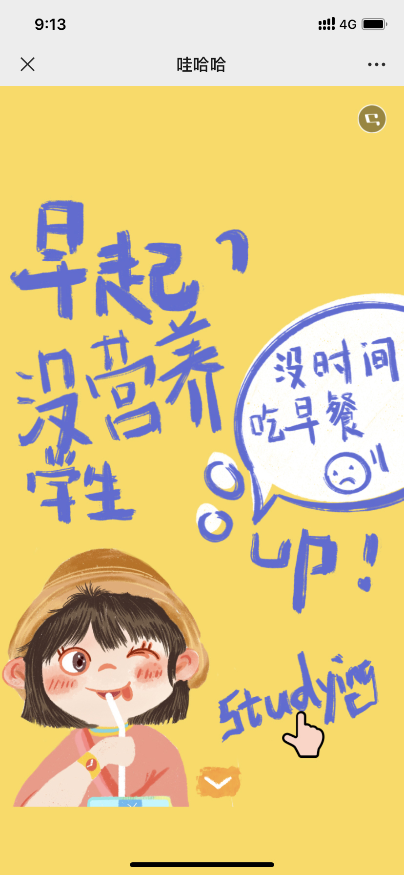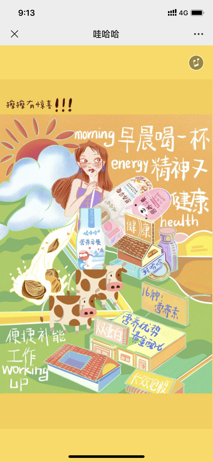 设计说明:选题根据本届大广赛“娃哈哈营养早餐”命题展开创作。清爽的奶味,营养的成分就是娃哈哈营养早餐。用插画的形式,体现不同人们的不同需求。学生没时间吃早餐怎么办?娃哈哈营养早餐给予他们丰富的双蛋白,16种营养元素快速补给。上班族没时间吃早餐怎办?充足奶源,饱腹的燕麦给你满满能量,快速让你能量加倍。没时间吃早晨怎么办?娃哈哈营养早餐来解决!
