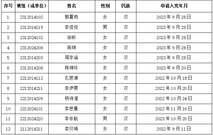 为进一步增强发展党员工作的透明度,严格发展党员工作程序,广泛听取党内外群众意见,接受广大党员群众监督,根据《中国共产党章程》和《中国共产党发展党员工作细则》,现将情况予以公示。