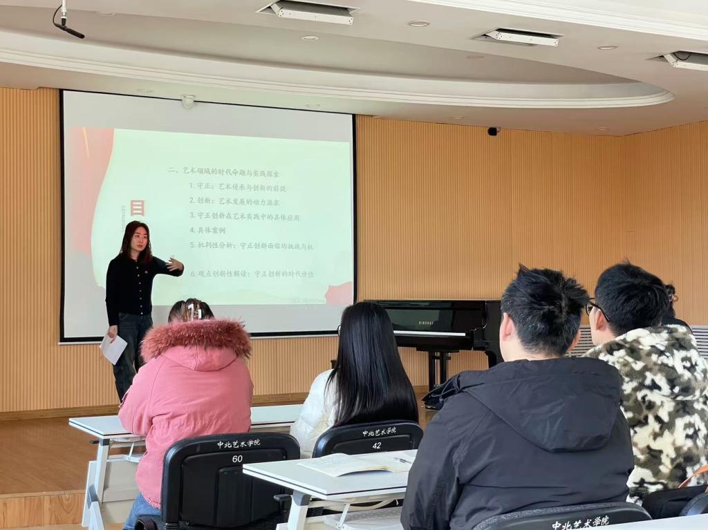 党委委员赵婧在12号楼研究生教室为研究生第一党支部就“党的二十届三中全会精神及其在艺术领域的守正创新实践”进行了深入解读和分享。围绕党的二十届三中全会精神并结合艺术领域的实际情况,探讨如何在守正中寻求创新,推动艺术实践与时代发展的深度融合。