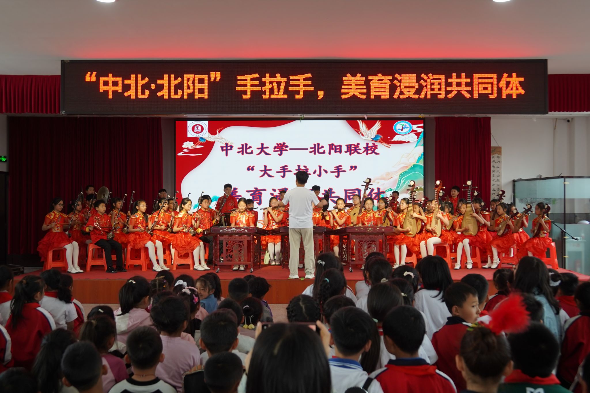 此次活动不仅为乡村孩子带来了生动有趣的艺术体验,更在高校与地方之间架起了美育共建的坚实桥梁。据悉,双方将以本次活动为起点,持续推动优质美育资源下沉,构建常态化、长效化美育帮扶机制,让艺术教育的阳光照亮乡村孩子的成长之路。活动尾声,全体参与师生登台合影,定格这一意义非凡的时刻,“中北·北阳”大手拉小手美育浸润共同体活动在温馨氛围中圆满落幕。