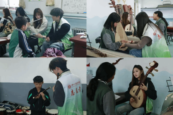 的师生们发挥专业优势,分组开展针对性艺术教学与互动交流。在器乐互动课堂上,悠扬的旋律萦绕课堂,大学生志愿者耐心讲解器乐基础知识,带领孩子们感受乐器演奏的魅力。声乐课堂里,童声与青春歌声相互交融,在循序渐进的发声练习、合唱互动中,激发孩子们的音乐感知力与表达欲。绘画创作课堂上,孩子们拿起画笔,在大学生的引导下尽情发挥想象力,用色彩与线条描绘心中的美好世界,沉浸式体验艺术创作的乐趣。
