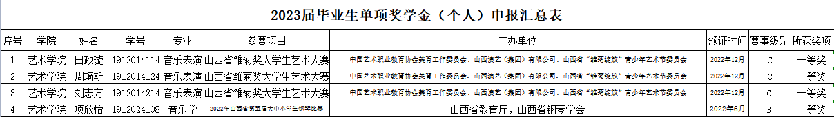单项奖学金评定依照《中北大学大学生奖学金评定实施细则》(校学字[2020]第11号)有关规定已评审结束。经个人申请——班级审核——学院审查,4人获得个人创新创业实践和竞赛奖学金。。现将名单公示在管网及文澜苑公示栏内,公示期3天,从2023年5月19日——21日。