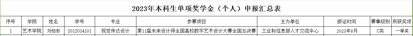 单项奖学金评定依照《中北大学大学生奖学金评定实施细则》(校学字[2020]第11号)有关规定已评审结束。经个人申请——班级审核——学院审查,获得个人创新创业实践和竞赛奖学金和学业进步奖学金名单如下。现将名单公示在管网及文澜苑公示栏内,公示期3天,从2023年10月10日——12日。