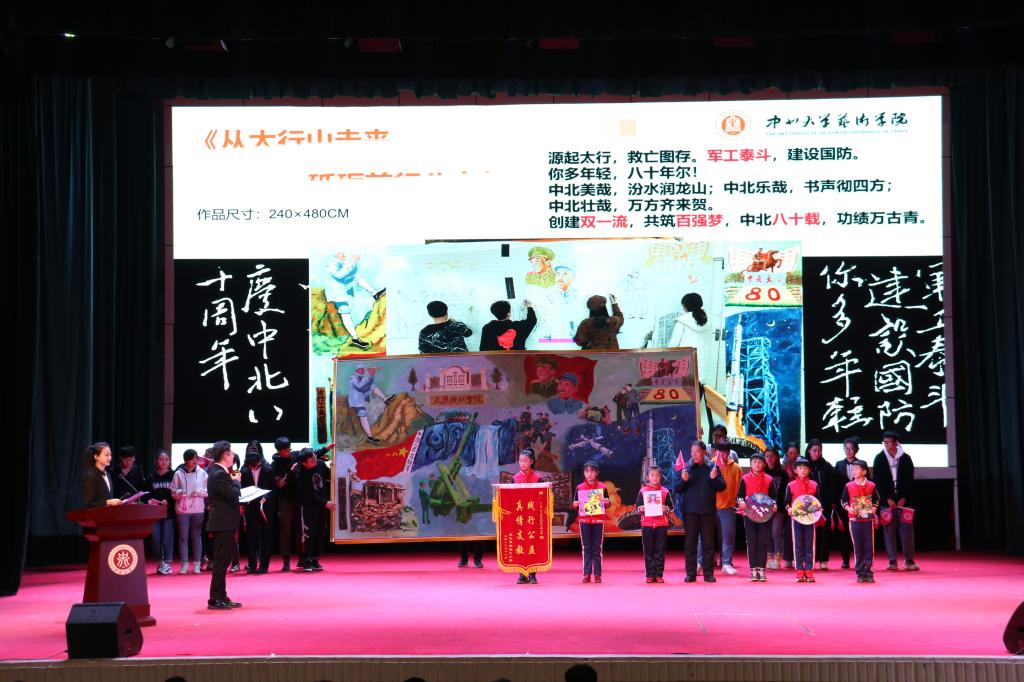 答辩即将接近尾声时,同学们以我校1941年太行工业学校到现在中北大学光辉历程为脉络,以我校重要科研成果为内容进行创作的主题为《从太行山走来,砥砺前行八十年》的篆刻和绘画作品拿到台前向大家展示,作为献给感恩中北教育之恩的生日礼物。