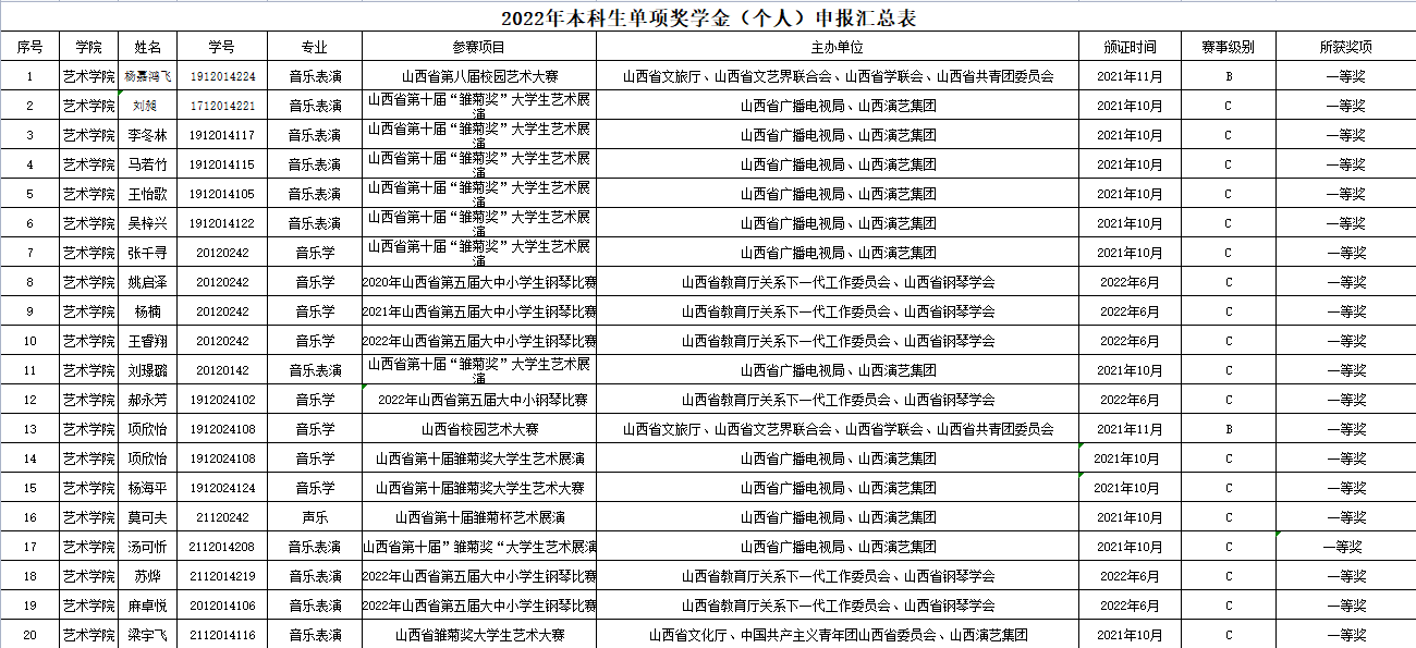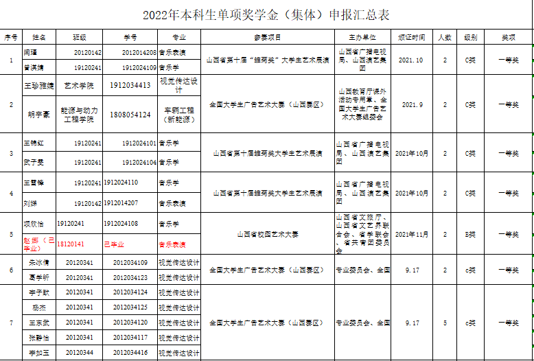 单项奖学金评定依照《中北大学大学生奖学金评定实施细则》(校学字[2020]第11号)有关规定已评审结束。经个人申请——班级审核——学院审查,获得个人创新创业实践和竞赛奖学金名单如下。现将名单公示在管网及文澜苑公示栏内,公示期3天,从2022年10月7日——9日。