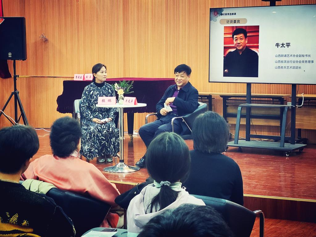 副教授张鹏主持,邀请国家一级演员张晶老师、中国黄河电视台主任播音员常虹老师、山西省朗诵艺术协会副会长兼秘书长李同生老师和山西老兵艺术团团长牛太平老师四位专家参与。各位专家与参会的大学生朋友们分享了朗读的感受、经验与技巧,现场演绎了名篇佳作的朗读,使同学们感受到声情并茂的艺术气息,受到了强烈的艺术熏陶。